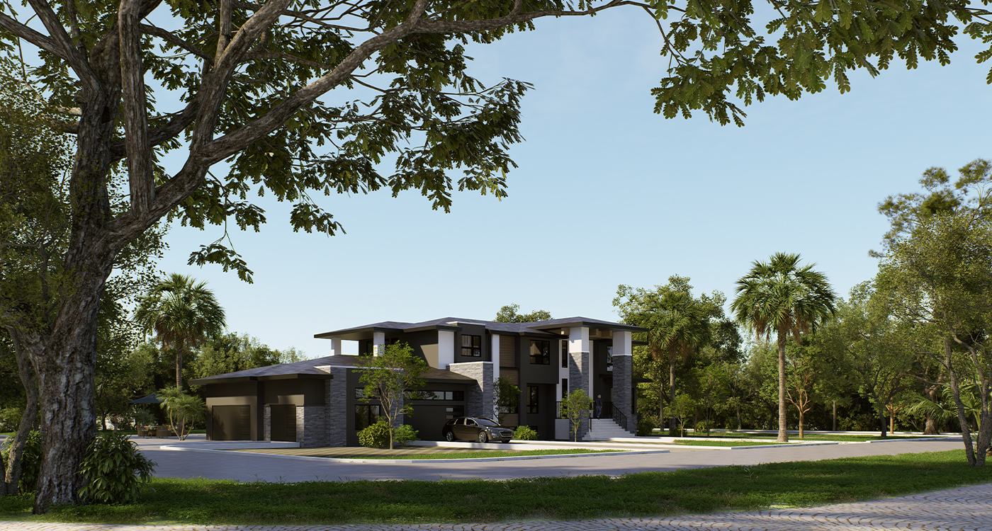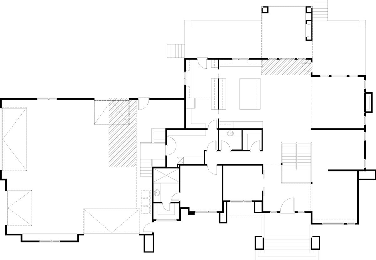 Upstairs, four spacious bedrooms each feature private bathrooms and walk-in closets. A loft opens to a rear terrace, offering stunning views and overlooking the living room below. The prairie modern design incorporates structural timbers, stone, and cedar siding, complemented by long overhangs and fascias, exuding a luxurious and timeless appeal.